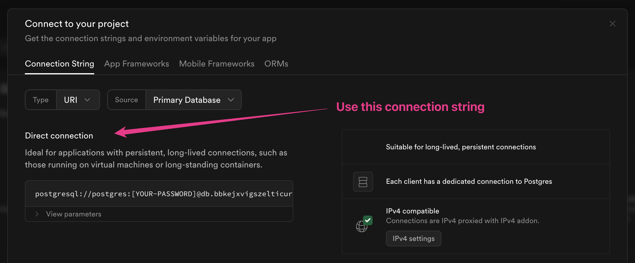 You may also need to assign an IPv4 address to your Supabase instance: